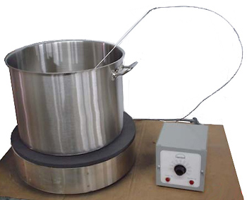 Model HP18S16 Hot Plate shown with a 5-gallon. stock pot.  Note thatthe thermocouple from the remote thermostat is immersed in the pot so that the hot plate is controlled using the temperature of the fluid rather than the plate surface