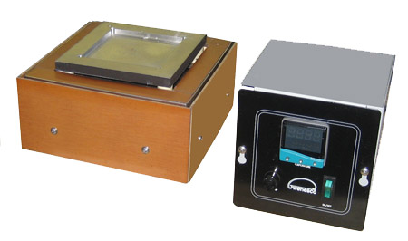 Temperature is controlled with a remote digital thermostat that displays current temperature and set point. This style is available up to a 24 x 24-inch plate size
