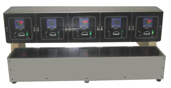 Model HP1836 hot plate shown with optional remote dual AH thermostat control. This upgrade from the standard single thermostat enables each half of the 18 X 36" plate to have its own temperature control. Model HPZ5 with 5 separate heating zones under a single hi-temp glass plate. Each zone is independently controlled with remote digital thermostats. Wenesco can custom make a multizone hot plate to suit your requirements.