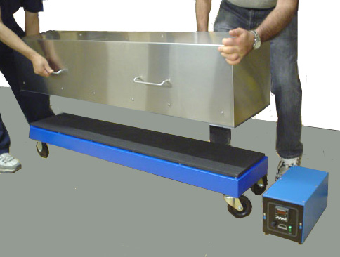 Custom hot plate with a 10 x 54-inch coated surface, mounted on casters, with a removable insulated hood. Temperature is controlled with a remote digital thermostat
